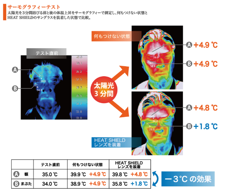 マイナス3℃の視界・ヒートシールド HEAT SHIELD 熱線と呼ばれる近赤外線を約90%ブロック、視界のクールダウンで集中力が続く。 |