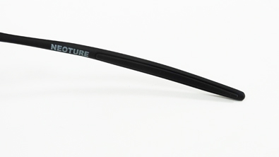 | ↓造形的な軽量アルミニウムテンプル | ↓テンプルエンドにズレを防止するUnobtaniumイヤーソックス搭載 |