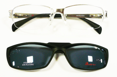 クリップオンと眼鏡を並べた状態。 跳ね上げ式のクリップオングラスで 非常に完成度の高いアイウェアに仕上がっています。 |