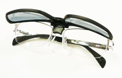 クリップオンと眼鏡を取り付けた状態 専用クリップオンで眼鏡とクリップの隙間を 極力少なくしました。 |