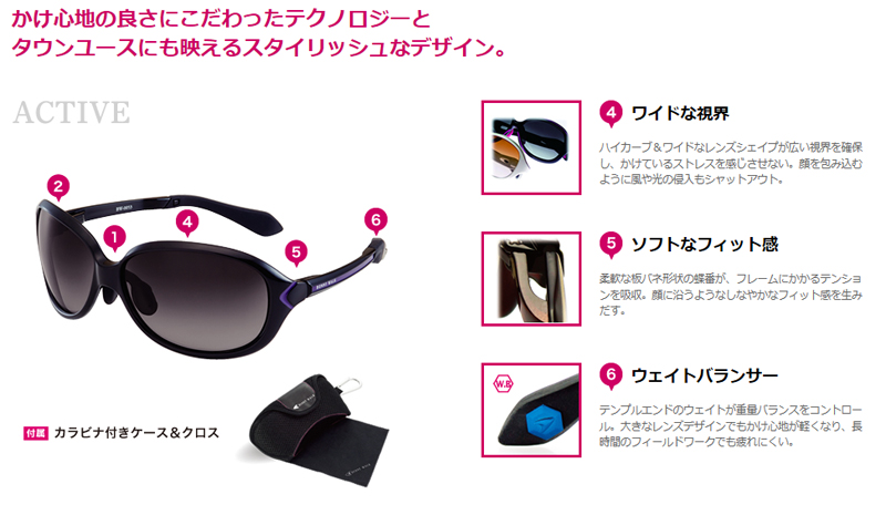 特殊な製法の日本製ポリカーボネート偏光レンズを採用。歪みが少なく、軽量で割れにくい。 両面に傷防止のハードコートを施し、スポーツやアウトドアでも安心の耐久性。 フィッシングでは水面のギラつきを、ドライブではフロントガラスの映り込みを、 木の葉やビル・路面の照り返しなど、様々な反射光を抑え眩しさや眼の疲れを和らげる。 有害な紫外線は99.9%以上カットし、レンズの大きなデザインがデリケートな目元をガード。 カラーは偏光では希少なグラデーションを含めた4タイプ。 |