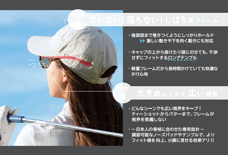 | 柔らかな印象のオーバルタイプ。 ロングテンプルが後頭部まで巻き付くようにしっかりホールド。 激しい動きや下を向く動きにも対応。 大きめのレンズがどんなシーンでも広い視界をキープ。 調整可能なノーズパッドやテンプルで、よりフィット感を向上。 |