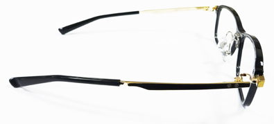 | プラスチックフロントの智元に切削を入れ、一段落としてフラットにしてからメタルパーツを配置。フロントに対して前面と側面の接地面を広く持たせて固定することにより、安定感のあるフロント強度を実現しています。逆Rヒンジを限りなくフロント近くに配置。掛け外しの際にかかる負荷に対して最小限の動きで、テンプル可動域を大きく確保することで、頭部を包み込む形状を崩すことなく、快適な環境を維持します。 |