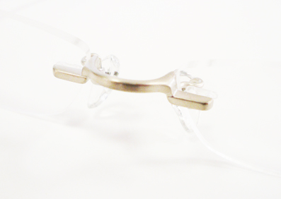 | 逆アールは、このTW-40Tシリーズ用に設計したものを使用しています。フロントに対する負荷を出来る限り軽減するため、長さ、幅、厚みをツーポイントに適したバランスで新たに設計しました。ツーポイントフレームにおいて、より効果的に機能します。また、掛けたときには逆アールの存在を感じさせずに、ツーポイント特有のすっきりとしたフロントの印象とサイドの美しい流れを際立たせ、フレーム全体の新質感を表現しています。 | 智〜テンプルへとつながるサイドは、すっきりとしたフロントとは対照的に、存在感のあるデザインです。智の上下面にはカットを入れ、掛けたときの智周辺の雰囲気を高めました。智に対してテンプル先端を二又にし、フロントとサイドの表情にギャップを持たせながらも、フロントからサイドへの美しい流れを演出しています。さらに一体感のあるサイドから表情を作るため、テンプルとモダン小口を4面で合わせてつなげています。 | |||||
