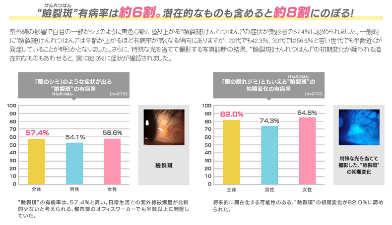 さらに、肌のシミと同ジように将来的に顕在化する可能性のある「眼の隠れジミ」ともいえる初期変化が認められる人も含めると、約8 割という非常に高い有病率であることがわかりました。“瞼裂斑(けんれつはん)”