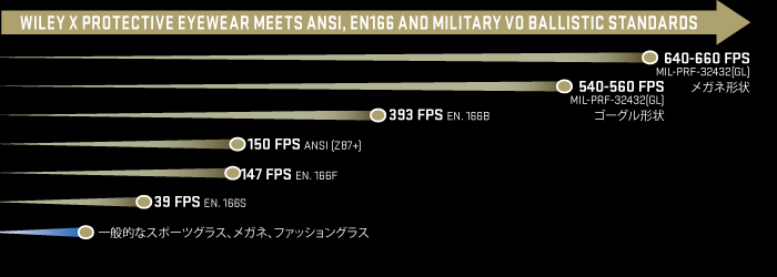 全てのWILEY XにはANSI Z87.1(Z87+)に定められたHIGH VELOCITY IMPACT(高速度衝撃)を遥かに上回る耐重圧度衝撃性能を有しています。時速164kmの25口径鋼弾による高速度衝撃の場合、一般的なサングラスではレンズが割れ、フレームが破損しますが全てのWILEY Xアイウェアは耐えれるのです。