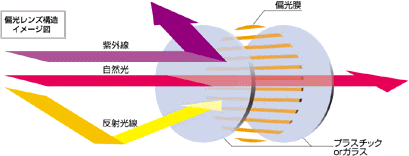 | この図のように偏光レンズとはレンズとレンズとの間に偏光膜(偏光フィルター)を挟み込みます。空気清浄機が汚れた空気をフィルターで除去し、綺麗な空気だけを排出するのと同じように偏光レンズは偏光膜で目の疲れの原因となる反射光を除去し、目に優しい光だけが目に入ります。 |
