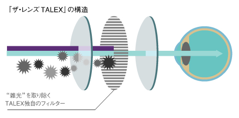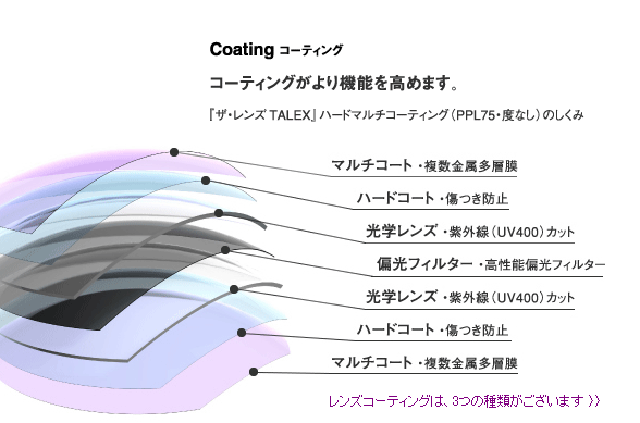 | TALEX独自開発の、高性能偏光フィルターがレンズの間に挟まれています。 そのため、有害な紫外線はもちろん、疲れ目の原因となる雑光をカットし、 あらゆるシーンでQOA(見え方の質)を高めます。 ![]() ![]() |