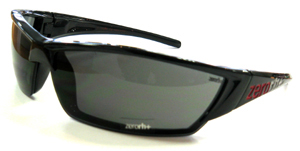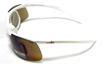 このように非常にレンズに柔軟性があり、指でも簡単に曲げられます。逆に言えば非常に安全性が高く、また割れないというのはもちろんですが、顔に強い衝撃があった場合に顔に傷を負う可能性が極めて低くなります。また、従来まであったポリカーボネートという素材とほぼ同等の強度をもちながら、歪みの少ない画期的なレンズです。軽さも水に浮く位の軽さで重量による負担もかなり軽減するまさに画期的な新構造のサングラスです!