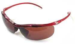 | ↑スポーツの激しい動きでもサングラスがズレないように考えられたデザイン | ↑紫外線の量でレンズの濃さが変わる調光レンズ。レンズの丸い部分は、紫外線をあてて変色させた箇所。 |